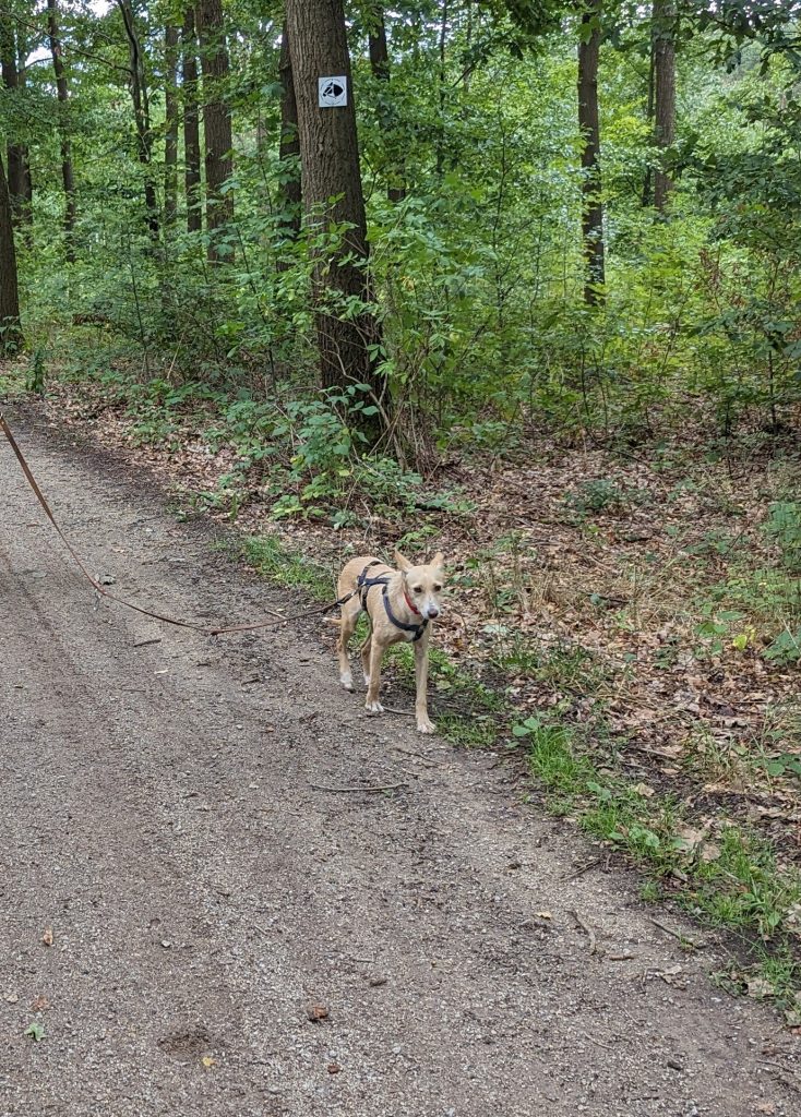 Dafür gab es aber heute auch einen Erfolg. Der erste Spaziergang im Wald. Hier reagiert Lucy auch auf jedes Geräusch sehr ängstlich. Jeder Windstoß oder ein kleines Rascheln im Gebüsch. Fremde Menschen, Radfahrer und wie sich die Zweibeiner heutzutage im Wald noch so fortbewegen. Alles ist neu und macht ihr Angst. Trotzdem hat man das Gefühl, dass sobald die Nase was zu riechen hat der Jagdhundekopf mal etwas vergessen kann und einfach Hund ist.