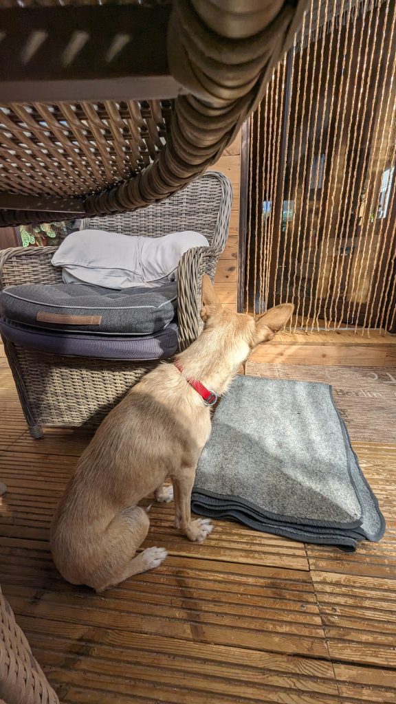 Heute morgen zeigt sie ein anderes Verhaltensmuster. Sie kommt alleine aus der Box und folgt uns ohne unser Zutun auf die Terrasse. Sie ist sich nicht sicher, geht rein und raus und rein und raus…..