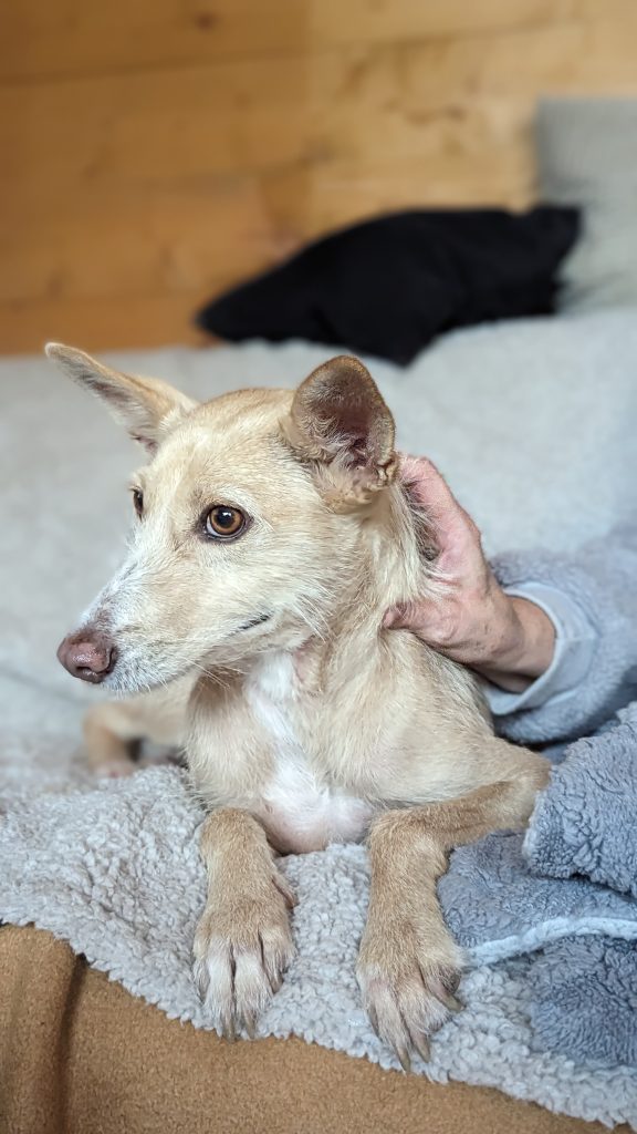 Ich entdecke einen kahle Stelle am Hals. Da kratzt sie sich auch immer mal. Ob sie sich gestern bei ihrer Jagd nach der Katze wieder irgendwo verletzt hat? Da geht sie ja über Stock und Stein und verschwindet auch mal in der Hecke. Ich gebe etwas Salbe drauf und Puder. Ich hoffe nur, es sind keine Flöhe oder Milben oder so was. Anzeichen dafür sehe ich jedenfalls nicht.